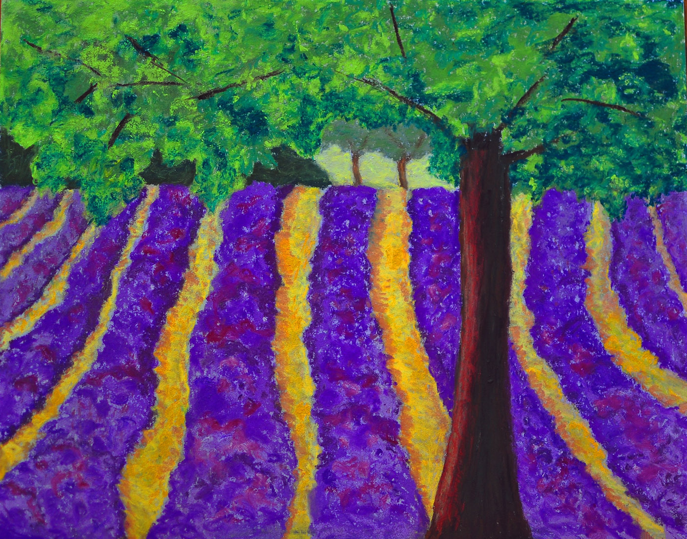 Provence is famous for its lavender fields. Unfortunately, we have never been here when they are blooming, but we are surrounded by images of those fields. This painting is my vision of those fields dominated by my own personal tree.