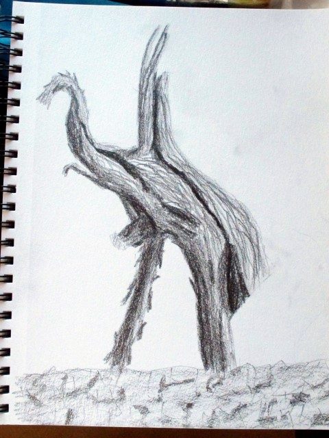 And yes, JP, we did some drawing today. I have set myself the goal on this trip to explore line, value, color, and shape. How does one begin? How do these interact? Can one be used without the others? What is foremost? Does it change with the subject? Yesterday a particular stump of a pinon tree caught my eye as a great subject for my first experiments. I began with line, but quickly decided that I needed value to make a portrait. All of my attempts with this subject I will call Quixhote’s Ghost.