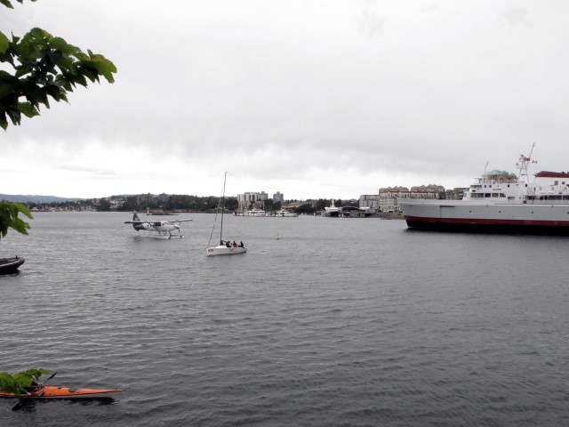 Black Ball ferry, sea plane, sailboat, and a kayak with a harbor police boat nosing in from the left.